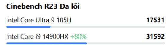 Với 24 nhân và 32 luồng, Core i9 14900HX vượt trội về hiệu suất đa nhiệm so với 16 nhân 22 luồng của Core Ultra 9 185H. Trong các bài test hiệu suất đa lõi, i9 14900HX có điểm số cao hơn 80% so với Ultra 9 185H: